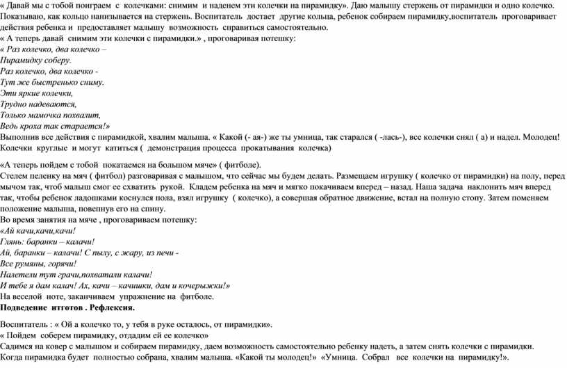 Вступительное слово – приветствие воспитателя для создания положительного эмоционального настроя и доверительных отношений. В ласковой форме воспитаткль обращается к ребенку по имени. Предлагаю малышу взять в руки массажный мячик для разминки рук и пальчиков, для дальнейшей игры в пирамидку. Читая потешку и выполняя движения соответственно тексту: « Я мячом круги катаю ( между ладоней по кругу), Взад – вперед его гоняю ( движения от себя – к себе). Им поглажу я ладошку ( глажу), А потом сожму немножко (сжимаем мяч). Каждым пальцем мяч прижму, И другой рукой начну. А теперь последний трюк – мяч летает между рук ( перекладываем мячик из одной руки в другую). Сюрпризный момент « Посмотри, какой я тебе мешочек принесла». «Давай, посмотрим, что там?» Воспитатель вместе с ребенком достают яркую пирамидку. « Да это же пирамидка!» Какая она красивая!» «Посмотри какие у нее яркие колечки и желтое , и красное , и синее». « Давай мы с тобой поиграем с колечками: снимим и наденем эти колечки на пирамидку». Даю малышу стержень от пирамидки и одно колечко. Показываю, как кольцо нанизывается на стержень. Воспитатель достает другие кольца, ребенок собираем пирамидку,воспитатель проговаривает действия ребенка и предоставляет малышу возможность справиться самостоятельно. « А теперь давай снимим эти колечки с пирамидки.» , проговаривая потешку: « Раз колечко, два колечко – Пирамидку соберу. Раз колечко, два колечко - Тут же быстренько сниму. Эти яркие колечки, Трудно надеваются, Только мамочка похвалит, Ведь кроха так старается!» Выполнив все действия с пирамидкой, хвалим малыша. « Какой (- ая-) же ты умница, так старался ( -лась-), все колечки снял ( а) и надел. Молодец! Колечки круглые и могут катиться ( демонстрация процесса прокатывания колечка)