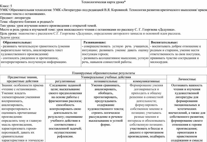 УМК/ Образовательная технология: УМК «Литература» под редакцией В.Я. Коровиной. Технология развития критического мышления/ прием «чтение текста с остановками».