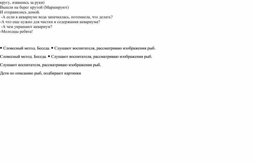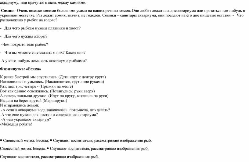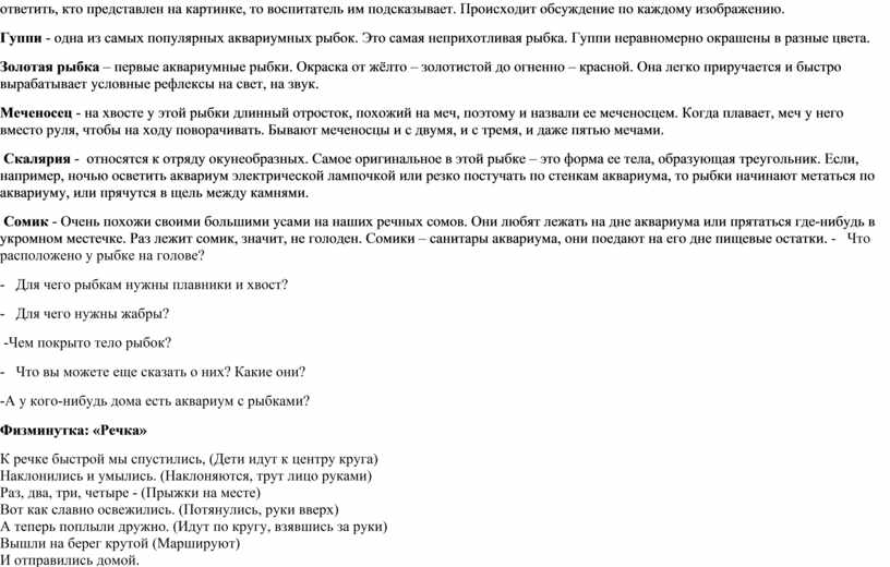 -Предлагаю вам познакомиться с самыми известными обитателями аквариума. Демонстрация изображений рыб, если дети затрудняются сами ответить, кто представлен на картинке, то воспитатель им подсказывает. Происходит обсуждение по каждому изображению. Гуппи - одна из самых популярных аквариумных рыбок. Это самая неприхотливая рыбка. Гуппи неравномерно окрашены в разные цвета. Золотая рыбка – первые аквариумные рыбки. Окраска от жёлто – золотистой до огненно – красной. Она легко приручается и быстро вырабатывает условные рефлексы на свет, на звук. Меченосец - на хвосте у этой рыбки длинный отросток, похожий на меч, поэтому и назвали ее меченосцем. Когда плавает, меч у него вместо руля, чтобы на ходу поворачивать. Бывают меченосцы и с двумя, и с тремя, и даже пятью мечами. Скалярия - относятся к отряду окунеобразных. Самое оригинальное в этой рыбке – это форма ее тела, образующая треугольник. Если, например, ночью осветить аквариум электрической лампочкой или резко постучать по стенкам аквариума, то рыбки начинают метаться по аквариуму, или прячутся в щель между камнями. Сомик - Очень похожи своими большими усами на наших речных сомов. Они любят лежать на дне аквариума или прятаться где-нибудь в укромном местечке. Раз лежит сомик, значит, не голоден. Сомики – санитары аквариума, они поедают на его дне пищевые остатки. - Что расположено у рыбке на голове? - Для чего рыбкам нужны плавники и хвост? - Для чего нужны жабры? -Чем покрыто тело рыбок? - Что вы можете еще сказать о них? Какие они? -А у кого-нибудь дома есть аквариум с рыбками? Физминутка: «Речка» К речке быстрой мы спустились, (Дети идут к центру круга) -А если в аквариуме вода запачкалась, потемнела, что делать? -А что еще нужно для чистки и содержания аквариума? -А чем украшают аквариум? -Молодцы ребята!