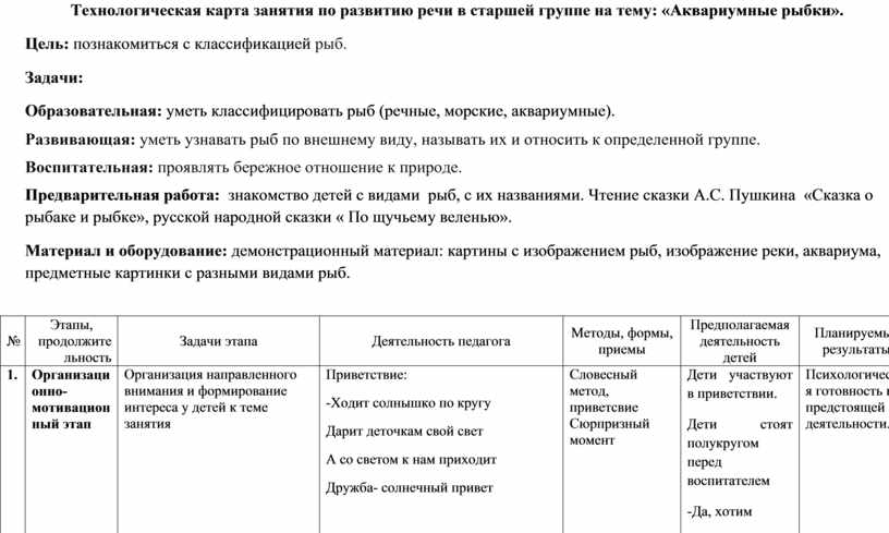Технологическая карта занятия по развитию речи в старшей группе на тему: «Аквариумные рыбки».