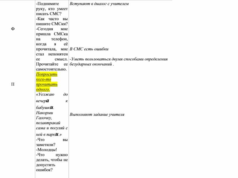 -Поднимите руку, кто умеет писать СМС? -Как часто вы пишите СМСки? -Сегодня мне пришла СМСка на телефон, когда я её прочитала, мне стал непонятен ее смысл. Прочитайте ее самостоятельно. Попросить кого-то прочитать одного. «Уезжаю до вечера к бабушки. Накорми Галочку, позавтракай сама и погуляй с ней в парки.» -Что вы заметили? -Молодцы! -Что нужно делать, чтобы не допустить ошибок?