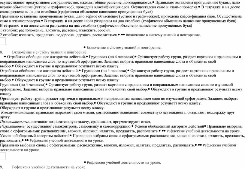В тетрадях и на доске слова разделены на два столбика (графически объяснено написание пропущенных букв) 1 столбик: расположение, вложить, растение, изложить, оросил. 2 столбик: излагать, предлагать, водоросли, держать, располагаться. |