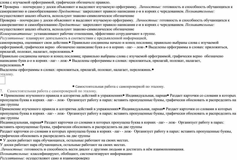 Проверка – поочередно у доски объясняют и выделяют изучаемую орфограмму. Личностные: готовность и способность обучающихся к саморазвитию и самообразованию Предметные: закрепляют правило написания е-и в корнях с чередованием. Познавательные: осуществляют анализ объекта, используют знаково-символическое обозначение Коммуникативные: устанавливают рабочие отношения, эффективно сотрудничают в группе. Регулятивные: планируют деятельность в соответствии с предъявленной информацией, самопроверка, оценивают свои действия. |