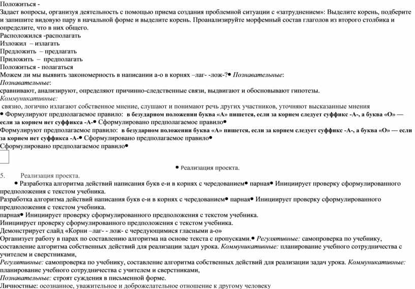 Демонстрирует на слайде слова: Расположился - Изложил – Предложить – Приложить – Положиться - Задает вопросы, организуя деятельность с помощью приема создания проблемной ситуации с «затруднением»: Выделите корень, подберите и запишите видовую пару в начальной форме и выделите корень. Проанализируйте морфемный состав глаголов из второго столбика и определите, что в них общего. Расположился -располагать Изложил – излагать Предложить – предлагать Приложить – предполагать Положиться - полагаться Можем ли мы выявить закономерность в написании а-о в корнях –лаг- -лож-? |