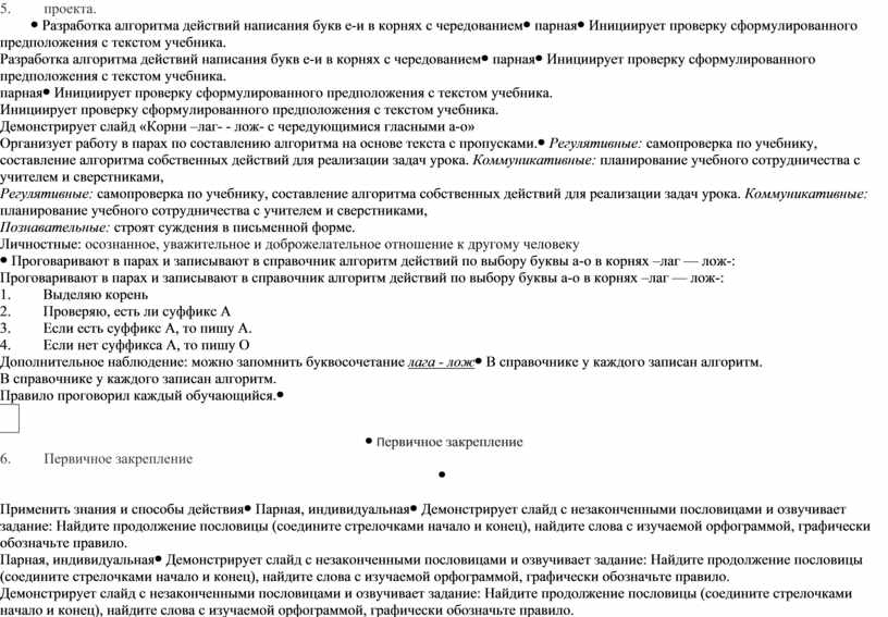 Инициирует проверку сформулированного предположения с текстом учебника. Демонстрирует слайд «Корни –лаг- - лож- с чередующимися гласными а-о» Организует работу в парах по составлению алгоритма на основе текста с пропусками. |