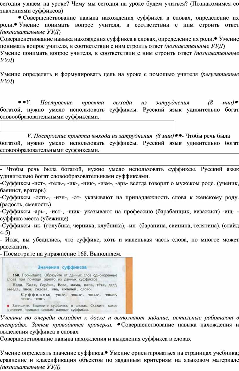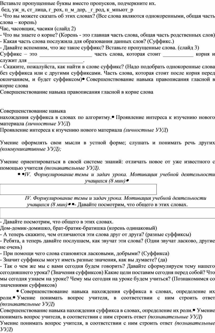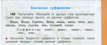 - создать условия для формирования умения находить и выделять суффиксы в словах, определять их роль в словах.