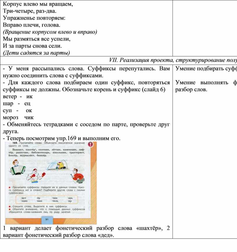 - У меня рассыпались слова. Суффиксы перепутались. Вам нужно соединить слова с суффиксами. - Для каждого слова подбираем один суффикс, повторяться суффиксы не должны. Обозначьте корень и суффикс (слайд 6) ветер - ик шар - ец суп - ок мороз чик - Обменяйтесь тетрадками с соседом по парте, проверьте друг друга. - Теперь посмотрим упр.169 и выполним его. 1 вариант делает фонетический разбор слова «шахтёр», 2 вариант фонетический разбор слова «дед». |