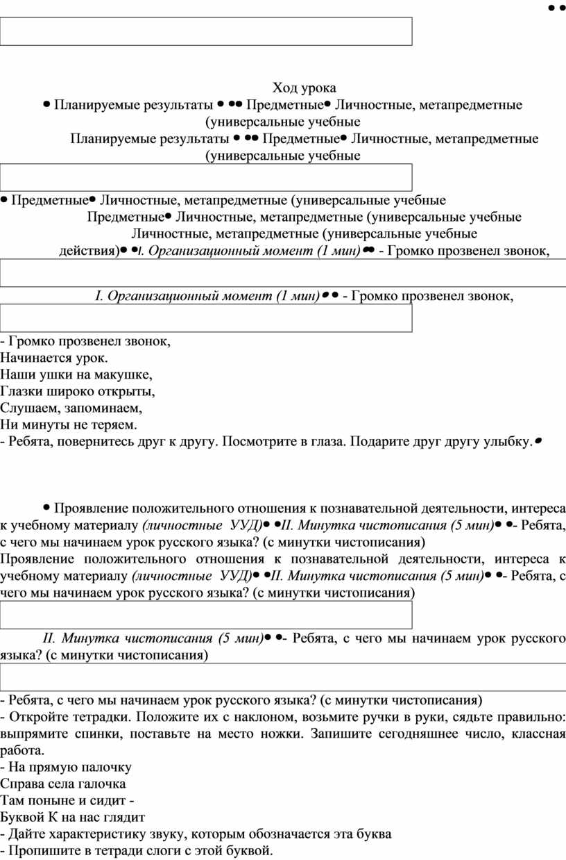 - Ребята, с чего мы начинаем урок русского языка? (с минутки чистописания) - Откройте тетрадки. Положите их с наклоном, возьмите ручки в руки, сядьте правильно: выпрямите спинки, поставьте на место ножки. Запишите сегодняшнее число, классная работа. - На прямую палочку Справа села галочка Там поныне и сидит - Буквой К на нас глядит - Дайте характеристику звуку, которым обозначается эта буква - Пропишите в тетради слоги с этой буквой. - Оцените свою индивидуальную работу по каллиграфии (письмо слогов с разным видом соединений): правильность выполнения, аккуратность выполнения.