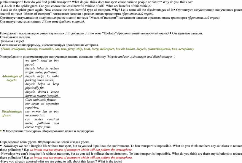 Организует актуализацию полученных ранее знаний по теме “Means of transport”: загадывает загадки о разных видах транспорта (фронтальный опрос). Организует систематизацию ЛЕ по теме (работа в парах).