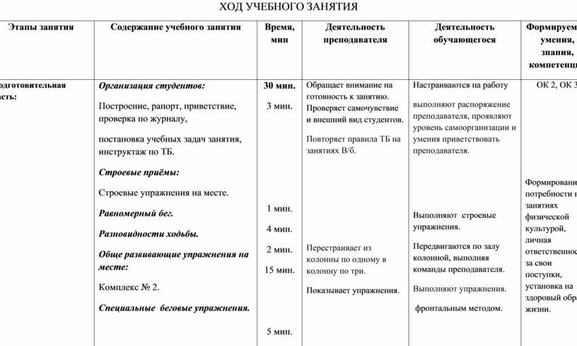 Организация студентов: Построение, рапорт, приветствие, проверка по журналу, постановка учебных задач занятия, инструктаж по ТБ. Строевые приёмы: Строевые упражнения на месте. Равномерный бег. Разновидности ходьбы. Обще развивающие упражнения на месте: Комплекс № 2. Специальные беговые упражнения. |