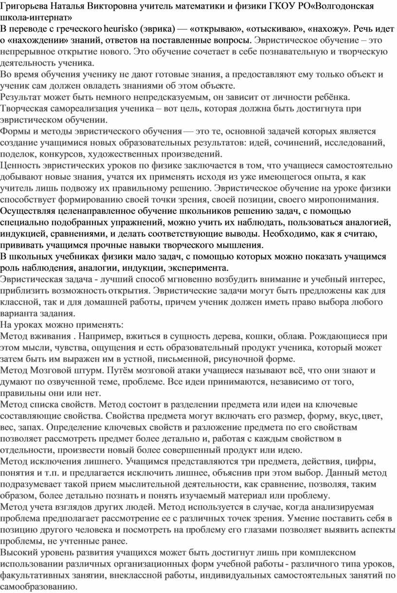 Григорьева Наталья Викторовна учитель математики и физики ГКОУ РО «Волгодонская школа-интернат»