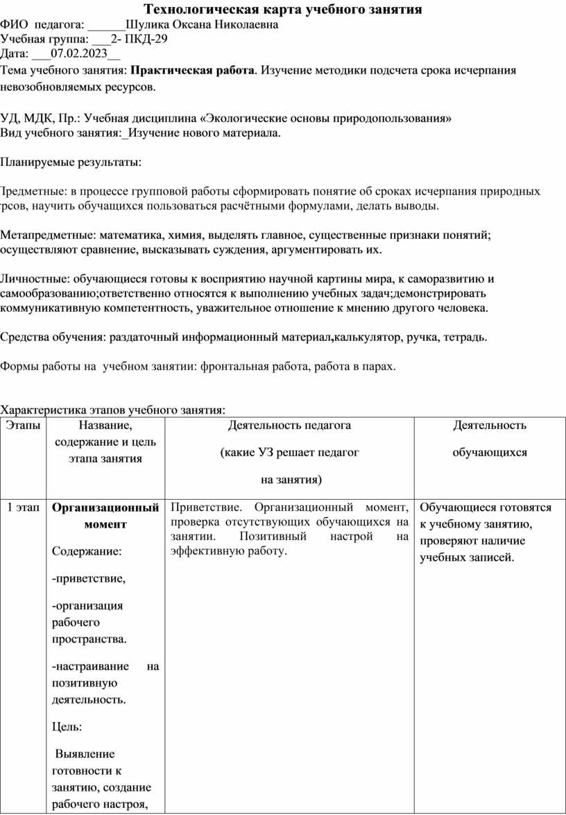 Тема учебного занятия: Практическая работа. Изучение методики подсчета срока исчерпания невозобновляемых ресурсов.