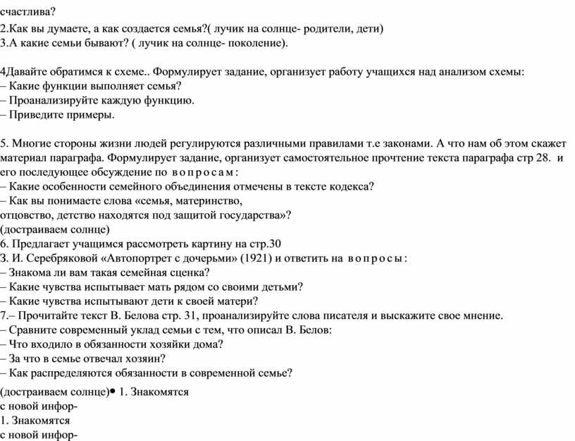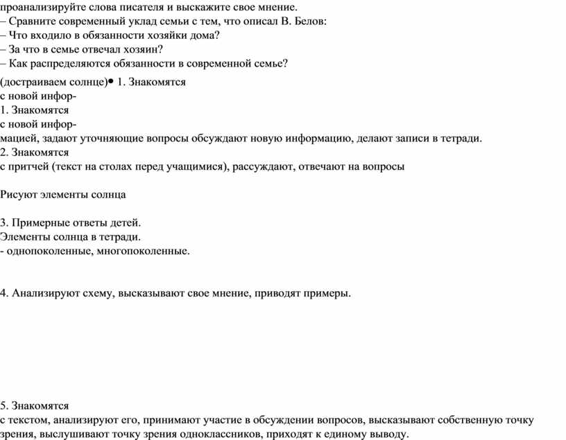 Предлагает учащимся рассмотреть картину на стр.30 – Знакома ли вам такая семейная сценка? – Какие чувства испытывает мать рядом со своими детьми? – Какие чувства испытывают дети к своей матери? 7.– Прочитайте текст В. Белова стр. 31, проанализируйте слова писателя и выскажите свое мнение. – Сравните современный уклад семьи с тем, что описал В. Белов: – Что входило в обязанности хозяйки дома? – За что в семье отвечал хозяин? – Как распределяются обязанности в современной семье? (достраиваем солнце) |