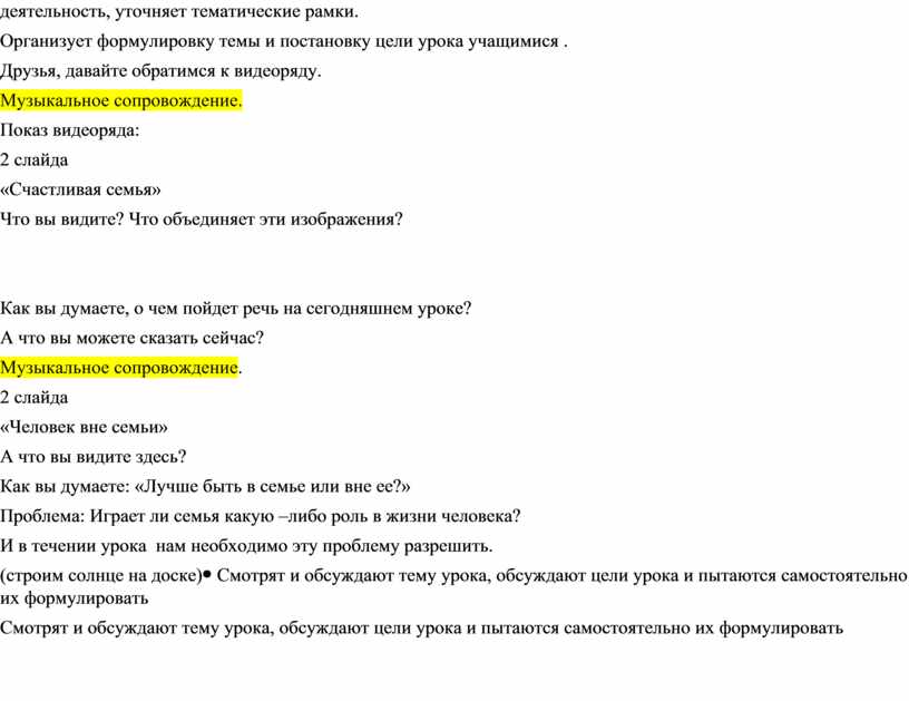 Создаёт условия для возникновения у обучающихся внутренней потребности включения в учебную деятельность, уточняет тематические рамки. Организует формулировку темы и постановку цели урока учащимися . Друзья, давайте обратимся к видеоряду. Музыкальное сопровождение. Показ видеоряда: 2 слайда «Счастливая семья» Что вы видите? Что объединяет эти изображения?