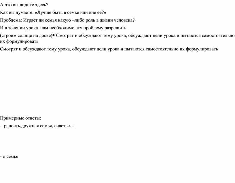 Как вы думаете, о чем пойдет речь на сегодняшнем уроке? А что вы можете сказать сейчас? Музыкальное сопровождение. 2 слайда «Человек вне семьи» А что вы видите здесь? Как вы думаете: «Лучше быть в семье или вне ее?» Проблема: Играет ли семья какую –либо роль в жизни человека? И в течении урока нам необходимо эту проблему разрешить. (строим солнце на доске) |