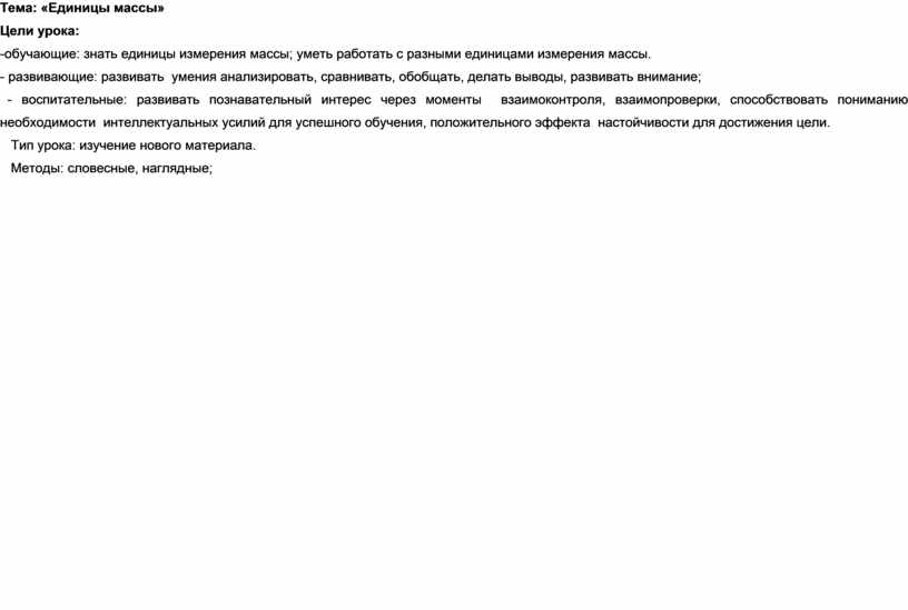 -обучающие: знать единицы измерения массы; уметь работать с разными единицами измерения массы.