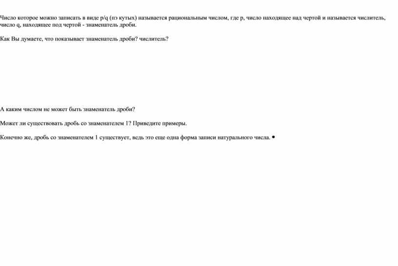 Число которое можно записать в виде p/q (пэ кутых) называется рациональным числом, где р, число находящее над чертой и называется числитель, число q, находящее под чертой - знаменатель дроби. Как Вы думаете, что показывает знаменатель дроби? числитель?