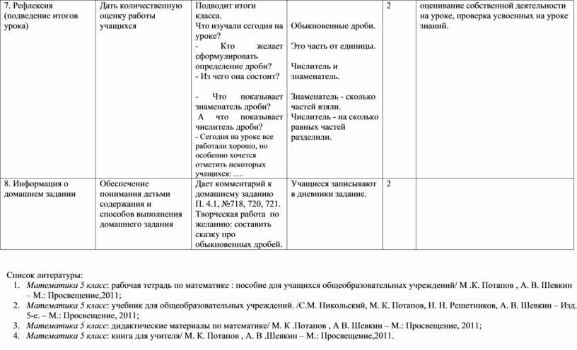 1. Математика 5 класс: учебник для общеобразовательных учреждений. /С.М. Никольский, М. К. Потапов, Н. Н. Решетников, А. В. Шевкин – Изд. 5-е. – М.: Просвещение, 2011;