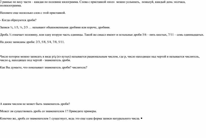 Определение дробей. Людям часто приходится делить целое на части. Делить можно, что угодно: яблоко, круг, торт, хлеб, арбуз. Если буханку хлеба весом 1 кг разрезать на 2 равные по весу части – каждая по половине килограмма. Слова с приставкой «пол» можно услышать, пожалуй, каждый день: полчаса, полкилограмма. Назовите еще несколько слов с этой приставкой. - Когда образуются дроби? Записи ½, 1/3, ¼, 2/3 … называют обыкновенными дробями или короче, дробями. Дробь ½ означает половину, или одну вторую часть единицы. Такой же смысл имеют и остальные дроби 5/6 – пять шестых, 7/11 – семь одиннадцатых. На доске записаны дроби: 2/3, 5/8, 5/4, 7/8, 5/11.