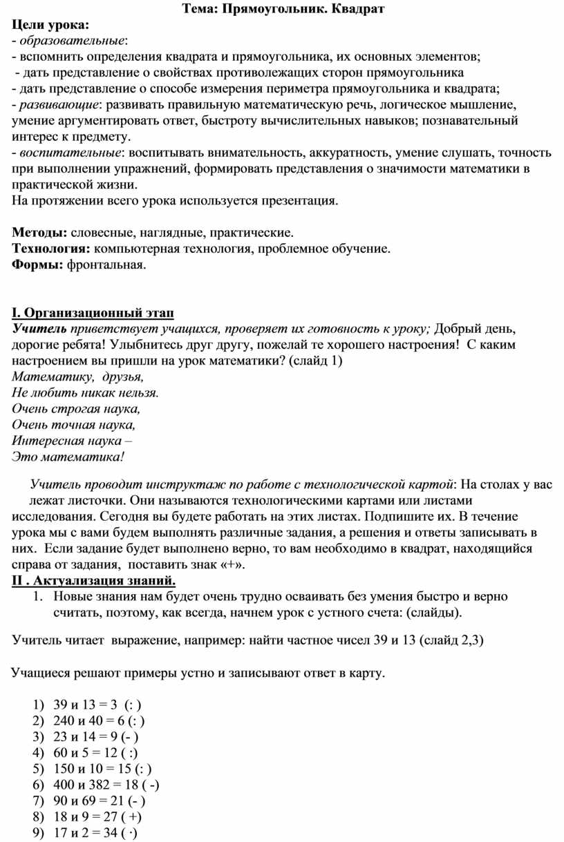 Учитель проводит инструктаж по работе с технологической картой: На столах у вас лежат листочки. Они называются технологическими картами или листами исследования. Сегодня вы будете работать на этих листах. Подпишите их. В течение урока мы с вами будем выполнять различные задания, а решения и ответы записывать в них. Если задание будет выполнено верно, то вам необходимо в квадрат, находящийся справа от задания, поставить знак «+».