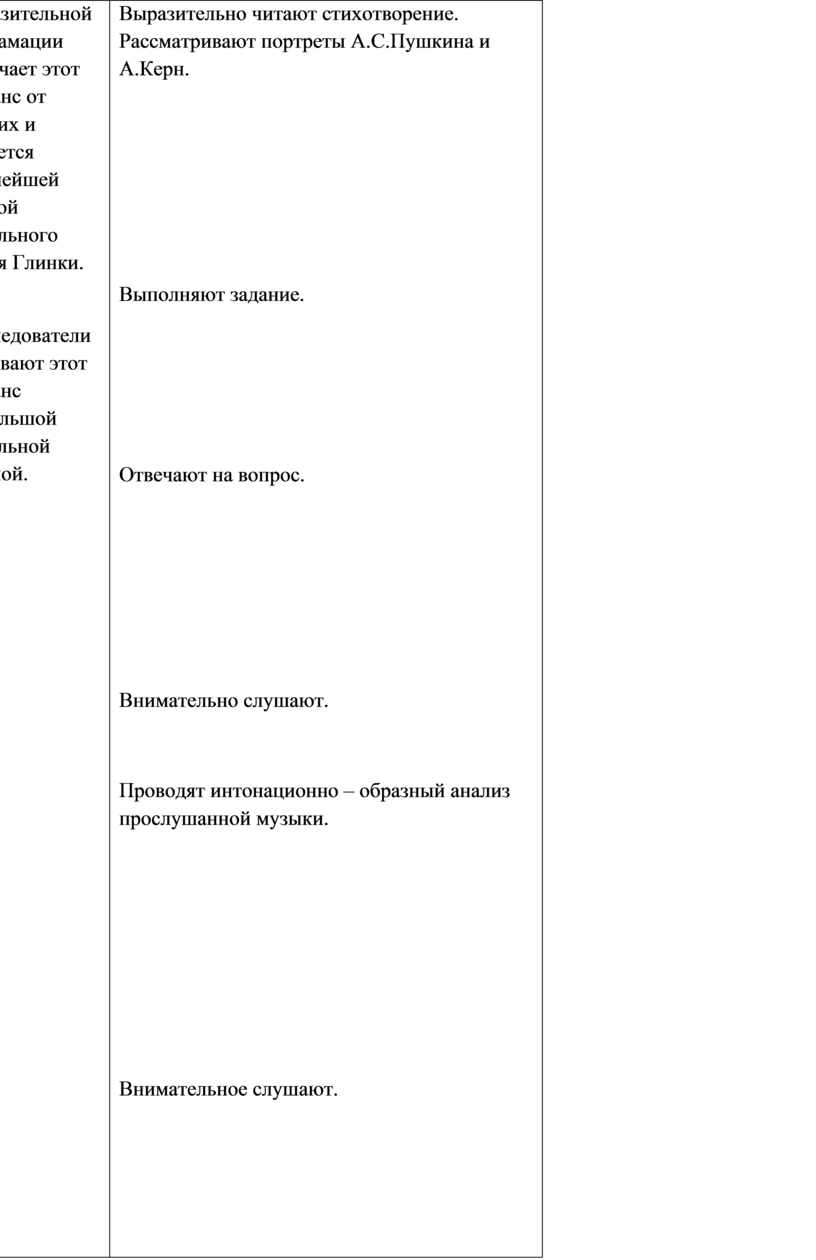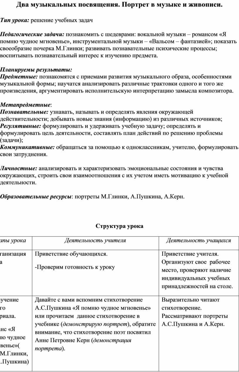 Педагогические задачи: познакомить с шедеврами: вокальной музыки – романсом «Я помню чудное мгновенье», инструментальной музыки – «Вальсом – фантазией»; показать своеобразие почерка М.Глинки; развивать познавательные психические процессы; воспитывать познавательный интерес к изучению предмета.