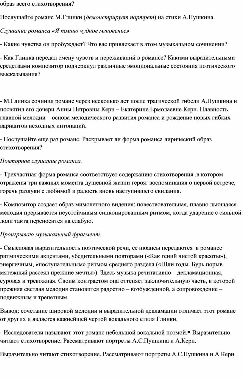2. Изучение нового материала. Романс «Я помню чудное мгновенье»( муз. М.Глинки, сл. А.Пушкина) |