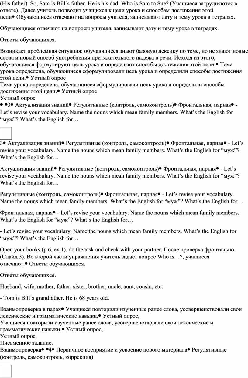 В лексике: активизировать и закрепить использование слов по теме «Семья» (родственные связи, черты характера, внешность) в устной и письменной речи. В чтении: научить находить в тексте специфическую информацию (имена, возраст, хобби членов семьи), игнорируя второстепенные детали. В грамматике: отработать правильное употребление притяжательного падежа существительных (Possessive Case) и глаголов to be / have got при описании семьи.