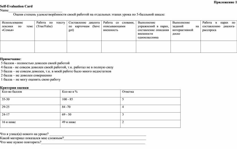 Учитель предлагает учащимся заполнить листы самооценки. - Fill in your Self-Evaluation Cards. По желанию выскажите свое мнение вслух. |