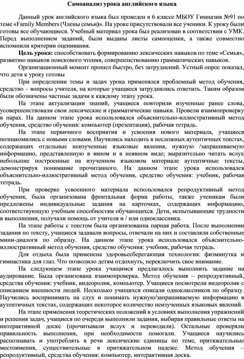 Данный урок английского языка был проведен в 6 классе МБОУ Гимназия №91 по теме «Family Members (Члены семьи)». На уроке присутствовали все ученики. К уроку были готовы все обучающиеся. Учебный материал урока был реализован в соответствии с УМК. Перед выполнением заданий, были выданы листы самооценки, а также совместно вспомнили критерии оценивания.