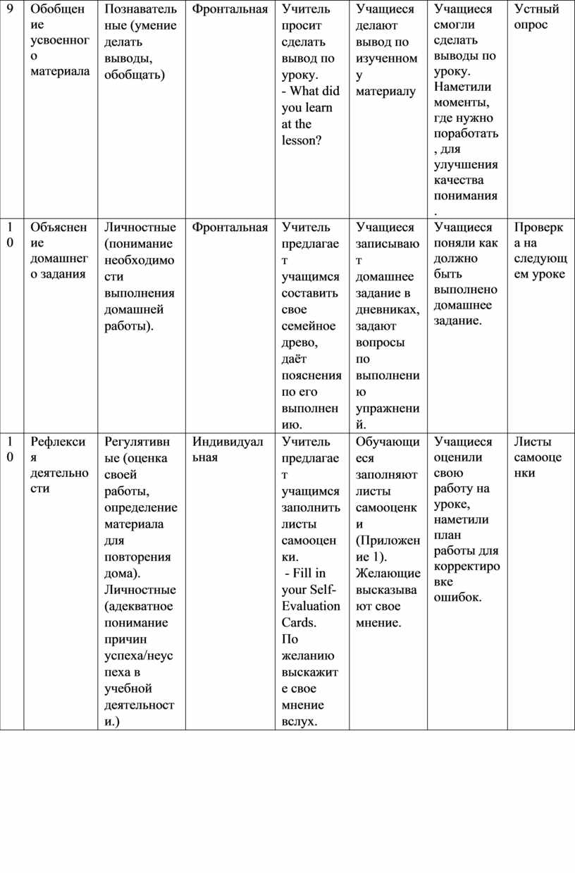 На заключительном этапе был подведен итог урока, было объяснено домашнее задание (составить свое семейное древо), даны пояснения по его выполнению, была проведена рефлексия деятельности, с использованием листов самооценки и проговариванием вслух, по желанию.