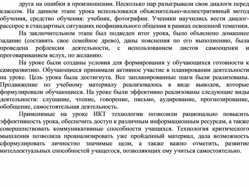 На уроке были созданы условия для формирования у обучающихся готовности к саморазвитию. Обучающиеся принимали активное участие в планировании деятельности на уроке. Цель урока была достигнута. Все запланированные шаги были реализованы. Продвижение по учебному материалу реализовалось в виде выводов, которые формулировали обучающиеся. На уроке были эффективно реализованы следующие виды деятельности: слушание, чтение, говорение, письмо, аудирование, прогнозирование, обобщение, самостоятельная деятельность.
