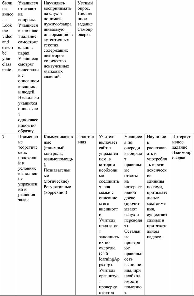 На следующем этапе урока учащимся предлагалось выполнить задание на аудирование. Была организована взаимопроверка. Метод обучения – репродуктивный, средства обучения: учебник, видеоролик, компьютер. Учащиеся посмотрели видеоролик с описанием внешности людей. Несколько учащихся описали одноклассников по образцу. Научились воспринимать на слух и понимать нужную/запрашиваемую информацию в аутентичных текстах, содержащих некоторое количество неизученных языковых явлений.