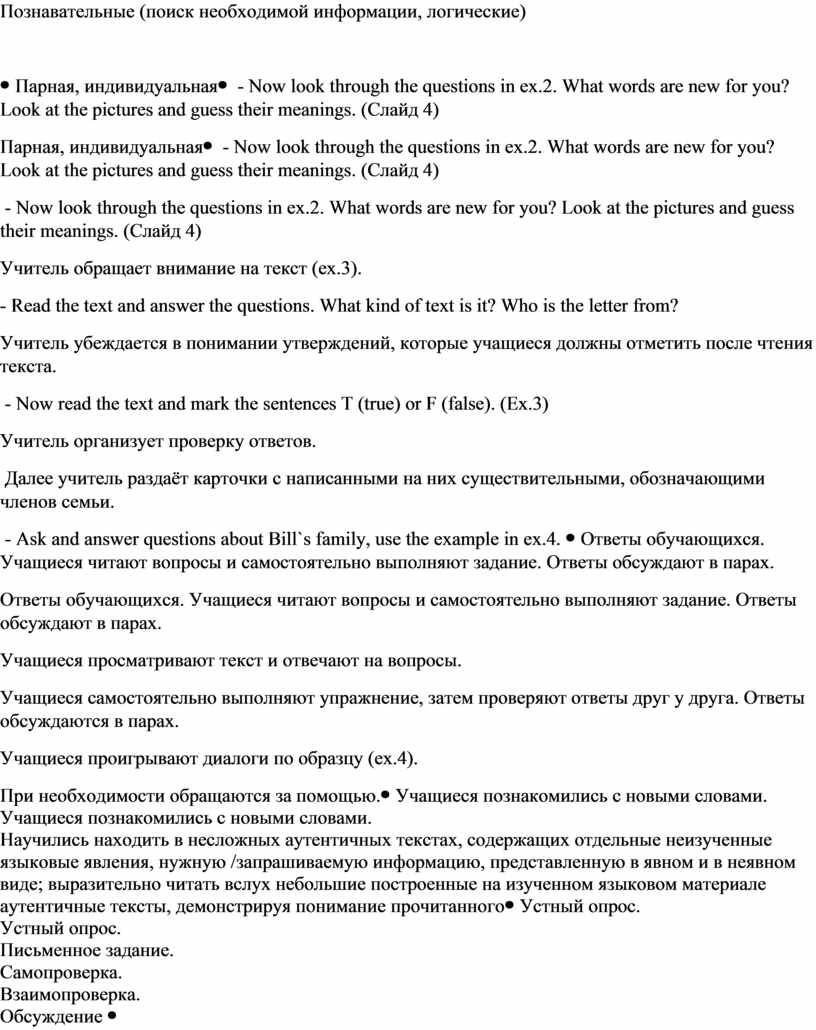 - Now look through the questions in ex.2. What words are new for you? Look at the pictures and guess their meanings. (Слайд 4) Учитель обращает внимание на текст (ex.3). - Read the text and answer the questions. What kind of text is it? Who is the letter from? Учитель убеждается в понимании утверждений, которые учащиеся должны отметить после чтения текста. - Now read the text and mark the sentences T (true) or F (false). (Ex.3) Учитель организует проверку ответов. Далее учитель раздаёт карточки с написанными на них существительными, обозначающими членов семьи. - Ask and answer questions about Bill`s family, use the example in ex.4. |