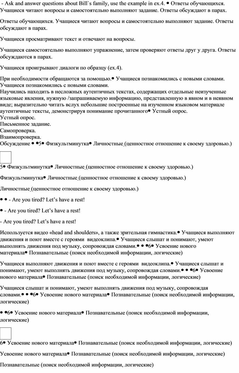 - Are you tired? Let’s have a rest! Используется видео «head and shoulders», а также зрительная гимнастика. |