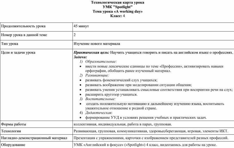 Практическая цель: Научить учащихся говорить и писать на английском языке о профессиях. Задачи: 1) Образовательные: · ввести новые лексические единицы по теме «Профессии», активизировать навыки орфографии, обобщить ранее изученный материал. 2) Развивающие: · развивать фонематический слух учащихся; · развивать воображение при моделировании ситуации общения; · развивать умения устанавливать смысловые соответствия при восприятии речи на слух; · расширить кругозор учащихся. 3) Воспитательные: · создать положительную мотивацию к дальнейшему изучению языка, воспитывать уважительное отношение к родной стране. 4) Дидактическая: · формирование УУД в условиях решения учебных и практических задач. |