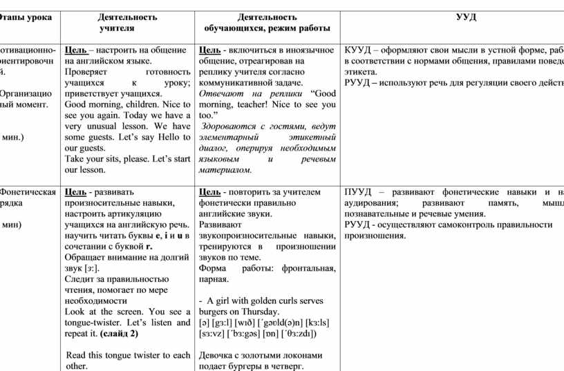 Цель - развивать произносительные навыки, настроить артикуляцию учащихся на английскую речь. научить читать буквы e, i и u в сочетании с буквой r. Обращает внимание на долгий звук [ɜ:]. Следит за правильностью чтения, помогает по мере необходимости Look at the screen. You see a tongue-twister. Let’s listen and repeat it. (слайд 2)