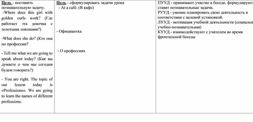 Цель - поставить познавательную задачу. -Where does this girl with golden curls work? (Где работает эта девочка с золотыми локонами?) -What does she do? (Кто она по профессии? - Tell me what we are going to speak about today? (Как вы думаете о чем мы сегодня будем говорить?) - You are right. The topic of our lesson today is «Professions». We are going to learn the names of different professions.