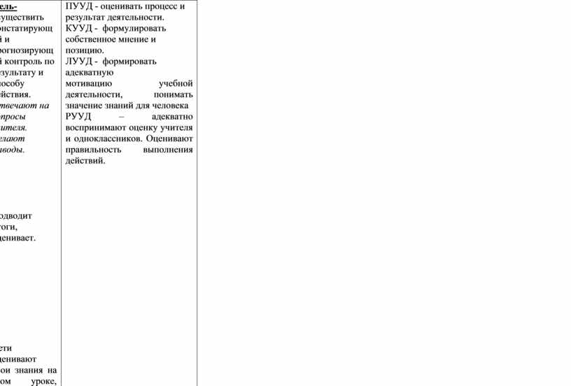 ПУУД - оценивать процесс и результат деятельности. КУУД - формулировать собственное мнение и позицию. ЛУУД - формировать адекватную мотивацию учебной деятельности, понимать значение знаний для человека РУУД – адекватно воспринимают оценку учителя и одноклассников. Оценивают правильность выполнения действий. |