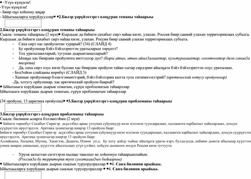 Кырдьык да биһиги сахабыт сирэ наһаа киэҥ, улахан. Россия биир саамай улахан территориялаах субъега. - Саха сирэ хас оройуонтан турарый? (34) (СЛАЙД 4) - Бу оройуоннар бэйэ бэйэлэриттэн уратыларын төрүөтэ? - Тох уратылаахтарый, тугунан дьарыктаналларый? - Ынаҕы хас биирдии оройуоҥҥа ииттэллэр дуо? (Бары атын, атын айыл5алаахтар, культуралаахтар, олохтоохтор диэн санаа5а тиэрдии) - Да, саха сирэ олус киэҥ буолан хас биирдии оройуон тайан сытар сирдэрин айылҕата бэйэ бэйэлэриттэн олус уратылаах. - Бол5ойон слайданы көрөбүт (СЛАЙД 5) - Ханнык оройуоннар бэлиэтэммиттэрий, бэйэ бэйэлэрин кытта туох ситимнээхтэрий? (арктическай хотугу оройуоннар) -Да, хотугу орйуоннар, хас арктическай оройуон баарый?