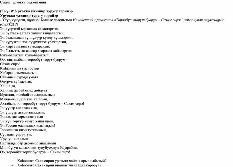 Уруокка үлэлиир туругу тэрийэр - Үтүө күнүнэн, оҕолор! Кылаас чааспытын Иннокентий Артамонов «Төрөөбүт төрүт буорум – Сахам сирэ!” хоьоонунан саҕалыаҕыҥ. (СЛАЙД 2) Эн күөрэгэй ырыалаах алаастаргын, Эн бултаах-алтаах халыҥ тайҕаларгын, Эн балыгынан күндүлүүр күндү күөллэргин, Эн күрүлгэннээх сүүрүктээх үрэхтэргин, Эн кырса мааны туундараҕын, Эн былыттыын аалсар хаардаах хайаларгын – Бука-барытын, бука-барытын, Оо, таптыыбын, төрөөбүт төрүт буорум – Сахам сирэ! Кыһынын мутук тостор Хабараан тымныыгын, Сайынын сүрэҕи умата Өҥүрүк куйааскын, Ханна да, Ханнык да бэйэлээх дойдуга Ыраатан, тэлэһийэн сылдьаммын Мэлдьитин долгуйа ахтабын, Ахтабын, оо, төрөөбүт төрүт буорум – Сахам сирэ! Эн үүнэр аналлааххын, Эн үрдүүр дьылҕалааххын, Эн алмаас сарыаллааххын Эн күн төрүүр көмүс хайатаҕын, Эн Россия маанылаах кыыһаҕын! Эйиигинэн киэн туттаммын, Сүрэҕим үөрүүтүн, Уруйун-айхалын Партияҕа, бар дьоммор анааммын Мин бүгүн ылыахпын-туоуйуохпун баҕарабын, Оо, төрөөбүт төрүт буолрум – Сахам сирэ!