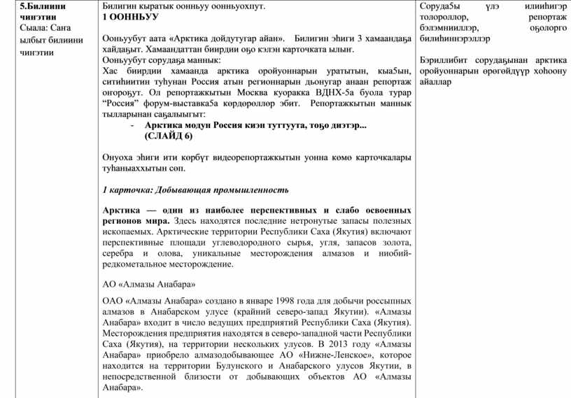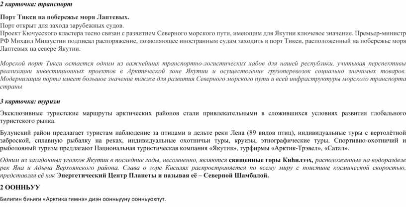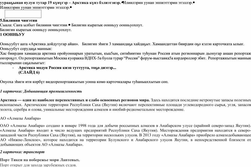 1 карточка: Добывающая промышленность Арктика — один из наиболее перспективных и слабо освоенных регионов мира. Здесь находятся последние нетронутые запасы полезных ископаемых. Арктические территории Республики Саха (Якутия) включают перспективные площади углеводородного сырья, угля, запасов золота, серебра и олова, уникальные месторождения алмазов и ниобий-редкометальное месторождение. АО «Алмазы Анабара» ОАО «Алмазы Анабара» создано в январе 1998 года для добычи россыпных алмазов в Анабарском улусе (крайний северо-запад Якутии). «Алмазы Анабара» входит в число ведущих предприятий Республики Саха (Якутия). Месторождения предприятия находятся в северо-западной части Республики Саха (Якутия), на территории нескольких улусов. В 2013 году «Алмазы Анабара» приобрело алмазодобывающее АО «Нижне-Ленское», которое находится на территории Булунского и Анабарского улусов Якутии, в непосредственной близости от добывающих объектов АО «Алмазы Анабара». 2 карточка: транспорт Порт Тикси на побережье моря Лаптевых. Порт открыт для захода зарубежных судов. Проект Кючусского кластера тесно связан с развитием Северного морского пути, имеющим для Якутии ключевое значение. Премьер-министр РФ Михаил Мишустин подписал распоряжение, позволяющее иностранным судам заходить в порт Тикси, расположенный на побережье моря Лаптевых на севере Якутии. Морской порт Тикси остается одним из важнейших транспортно-логистических хабов для нашей республики, учитывая перспективы реализации инвестиционных проектов в Арктической зоне Якутии и осуществление грузоперевозок социально значимых товаров. Модернизация порта имеет большое значение также для развития Северного морского пути и всей инфраструктуры морского транспорта страны 3 карточка: туризм Эксклюзивные туристские маршруты арктических районов стали привлекательными в сложившихся условиях развития глобального туристского рынка. Булунский район предлагает туристам наблюдение за птицами в дельте реки Лена (89 видов птиц), индивидуальные туры с вертолётной заброской, сплавную рыбалку на реках, индивидуальные охотничьи туры, круизы, этнографические туры. Спортивно-охотничий и рыболовный туризм предлагают Национальная туристическая компания «Якутия», турфирмы «Арктик-Трэвел», «Сатал». Одним из загадочных уголков Якутии в последние годы, несомненно, являются священные горы Киhилээх, расположенные на водоразделе рек Яна и Адыча Верхоянского района. Слава о горе Кисилях распространяется по всему миру с поистине космической скоростью, представляя её как Энергетический Центр Планеты и называя её – Северной Шамбалой. 2 ООННЬУУ Билигин биһиги «Арктика гимнэ» диэн оонньууну оонньуохпут. - Бары төгүрүччү турабыт - хас биирдии оҕо биирдии туохтууру толкуйдуур, арктиканы кытта сибээстээх - онтон иккилии буолан холбоһобут уонна толкуйдаабыт туохтуургутугар тыл эбэн тыл ситимин толкуйдуугут - пааранан холбоһобут уонна айбыт тыл ситимнэргит көмөтүнэн түөртүү строкалаах хоһоон айаҕыт - билигин хоһооннорбутун холбоон арктика гимнин таһаарыахха