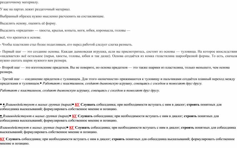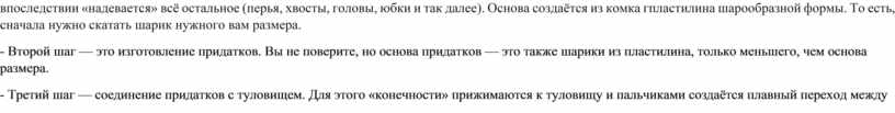- Приступаем к выполнению игрушки по раздаточному материалу. У вас на партах лежит раздаточный материал. Выбранный образец нужно мысленно расчленить на составляющие. Выделить основу, оценить её форму. Выделить «придатки» — хвосты, крылья, копыта, ноги, юбки, коромысла, головы — всё, что крепится к основе. - Чтобы пластилин стал более податливым, его перед работой следует слегка размыть. - Первый шаг — это создание основы. Каждая дымковская игрушка, если вы присмотритесь, состоит из основы — туловища. На которое впоследствии «надевается» всё остальное (перья, хвосты, головы, юбки и так далее). Основа создаётся из комка гпластилина шарообразной формы. То есть, сначала нужно скатать шарик нужного вам размера. - Второй шаг — это изготовление придатков. Вы не поверите, но основа придатков — это также шарики из пластилина, только меньшего, чем основа размера. - Третий шаг — соединение придатков с туловищем. Для этого «конечности» прижимаются к туловищу и пальчиками создаётся плавный переход между придатками и туловищем. |