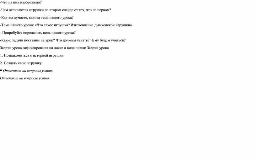 Формулируют тему урока: «Что такое игрушка? Изготовление дымковской игрушки» Ставят цель: сформировать представление и расширить знания о традиционном игрушечном промысле, об особенностях художественного и конструкторско-технологического отбора игрушки в современном мире через решение проблемных творческих ситуаций на уроке технологии, овладение практическими навыками изготовления игрушки из пластилина, развитие мелкой моторики. Составляют (при участии педагога) задачи: 1.Познакомиться с историей игрушки. 2. Создать свою игрушку. |