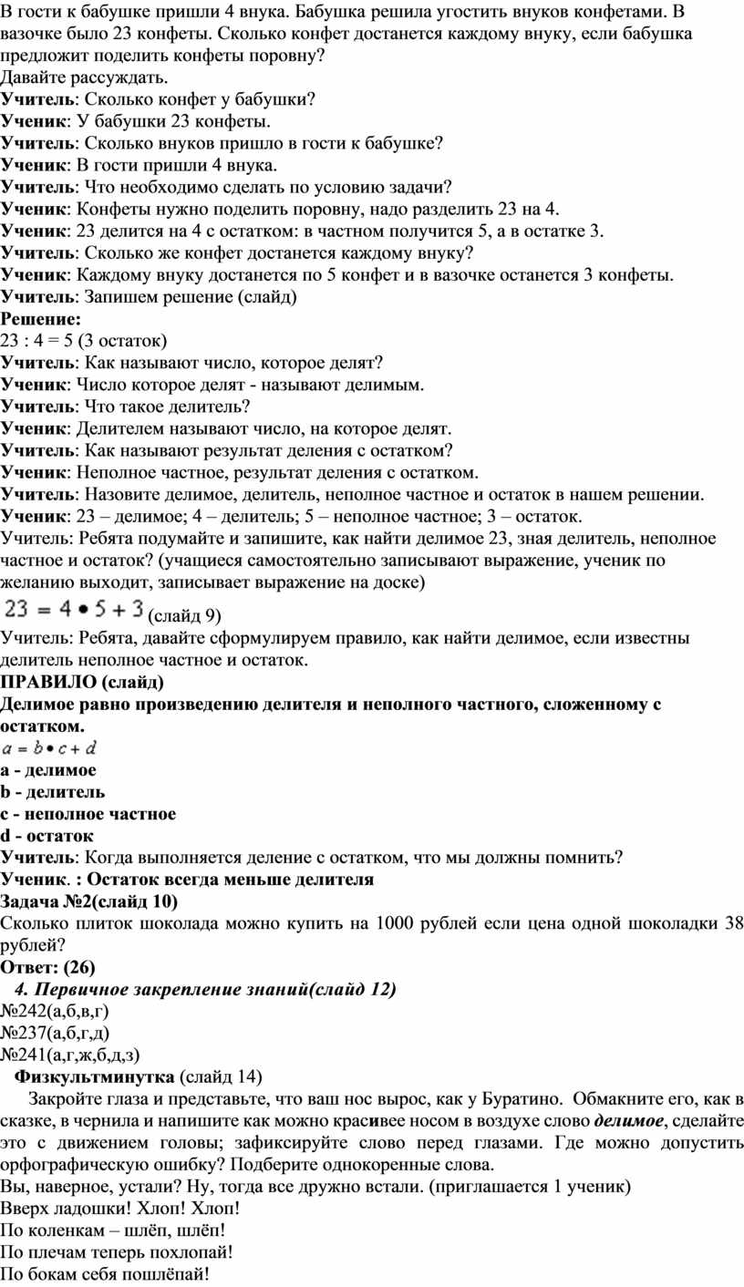 Учитель: Ребята, давайте сформулируем правило, как найти делимое, если известны делитель неполное частное и остаток.
