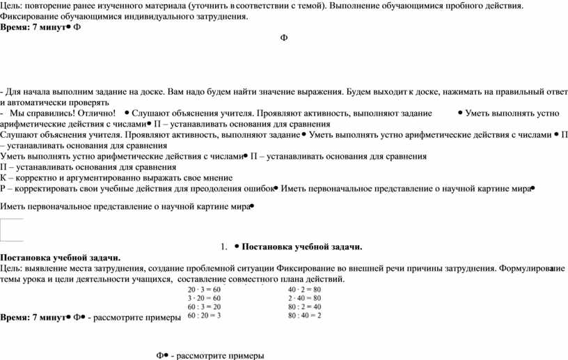 Актуализация опорных знаний. Пробное действие. Цель: повторение ранее изученного материала (уточнить в соответствии с темой). Выполнение обучающимися пробного действия. Фиксирование обучающимися индивидуального затруднения. Время: 7 минут |
