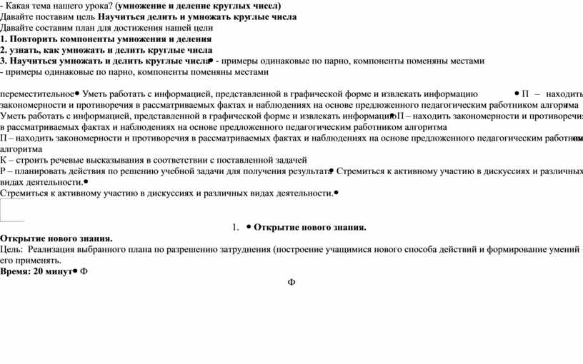 - рассмотрите примеры - Что вы видите особенного? Все выражения разные? -Какое свойство умножения помогло нам найти значение выражений во второй строке? - Какое свойство помогло составить выражения в третьей и четвертой строке? (если произведение разделить на один из множителей, то получиться второй множитель) - Какие числа встречаются в этих выражениях чаще? Круглые - какие действия мы соверашем с этими числами? - Какая тема нашего урока? (умножение и деление круглых чисел) -Давайте поставим цель Научиться делить и умножать круглые числа - Давайте составим план для достижения нашей цели 1. Повторить компоненты умножения и деления 2. узнать, как умножать и делить круглые числа 3. Научиться умножать и делить круглые числа |