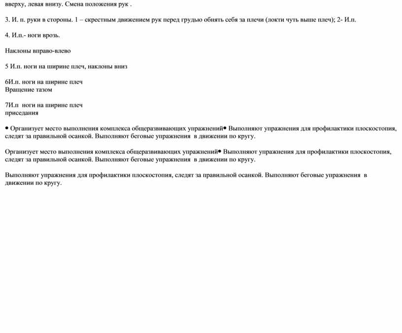 Разминка. Строевые упражнения. Упражнения в ходьбе: - ходьба на носках, руки в замок вверху, спина прямая; -ходьба на пятках, руки в замок за головой; -на внешне стороне стопы, руки на поясе; -перекатами с пятки на носок; Упражнения в беге: 1) бег захлёст голени назад, 2) бег с высоким подниманием бедра; 3) приставными шагами правым и левым боком; 4)прыжки на одной ноге. Разминка Круговые движения руками на1- 4 счёта вперёд, на 5-8 назад. 2. И. п. – правая рук вверху, левая внизу. Смена положения рук . 3. И. п. руки в стороны. 1 – скрестным движением рук перед грудью обнять себя за плечи (локти чуть выше плеч); 2- И.п. 4. И.п.- ноги врозь. Наклоны вправо-влево 5 И.п. ноги на ширине плеч, наклоны вниз