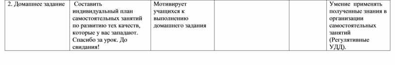 Составить индивидуальный план самостоятельных занятий по развитию тех качеств, которые у вас западают. Спасибо за урок. До свидания! |