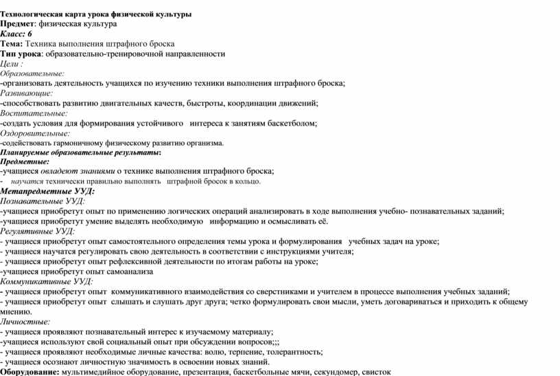 Технологическая карта урока физической культуры