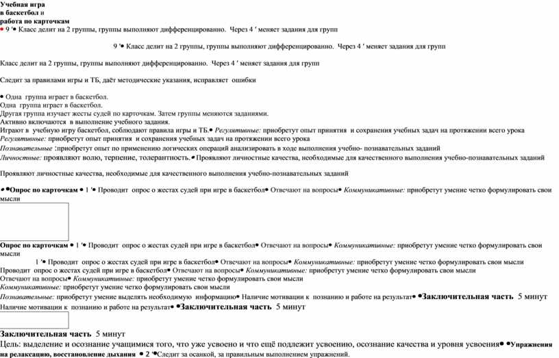 Учебная игра в баскетбол и работа по карточкам